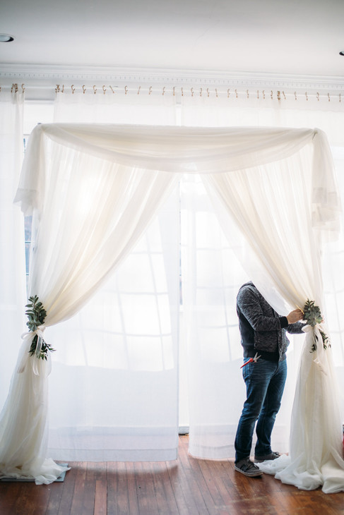 It's not every day that we get to host a beautiful, intimate wedding here at Studio 92 in Chestnut Hill. We love having events such as these take place in the studio because it is the perfect atmosphere to cultivate a intimate and personalized experience. The setup was minimal but very effective. We removed all of the photography related equipment to leave a blank canvas of white walls and hardwood floors against a backgrounds of beautiful curtains that diffused the light entering the large windows. In fact, we added additional decorative curtains to give the space extra flare.